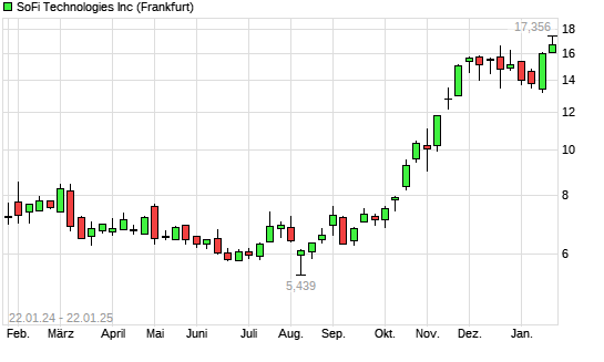 Mit dem Anstieg auf 17,23 EUR hat die SoFi Technologies-Aktie (ISIN US83406F1021) am 21.01.2025 ein neues 3-Jahres-Hoch erreicht und damit den Kurs vom 20.01.2025 eingestellt.
