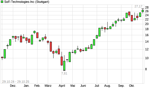 Mit dem Anstieg auf 27,07 EUR hat die SoFi Technologies-Aktie (ISIN US83406F1021) am 28.10.2025 ein neues All-Time-High erreicht und damit den Kurs vom 27.10.2025 eingestellt.