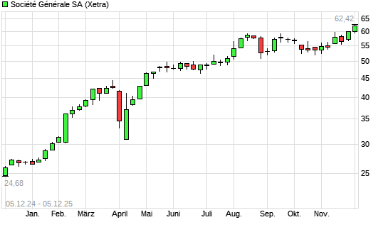 Mit dem Anstieg auf 62,38 EUR hat die Société Générale-Aktie (ISIN FR0000130809) am 04.12.2025 ein neues 10-Jahres-Hoch erreicht und damit den Kurs vom 02.12.2025 eingestellt.