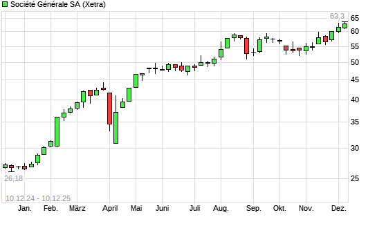 Mit dem Anstieg auf 62,72 EUR hat die Société Générale-Aktie (ISIN FR0000130809) am 09.12.2025 ein neues 10-Jahres-Hoch erreicht und damit den Kurs vom 04.12.2025 eingestellt.