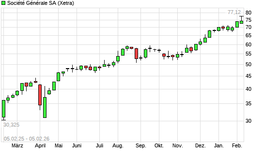 Mit dem Anstieg auf 76,34 EUR hat die Société Générale-Aktie (ISIN FR0000130809) am 04.02.2026 ein neues 10-Jahres-Hoch erreicht und damit den Kurs vom 03.02.2026 eingestellt.