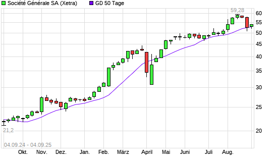 Mit dem Anstieg auf 53,04 EUR hat die Société Générale-Aktie am 03.09.2025 die 50-Tage-Linie nach oben gekreuzt.