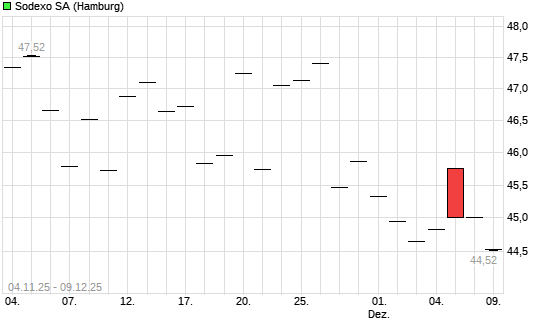 Mit dem Rücksetzer auf 44,20 EUR hat die Sodexo-Aktie (ISIN FR0000121220) am 08.12.2025 ein neues 5-Jahres-Tief erreicht und damit den Kurs vom 02.12.2025 eingestellt.