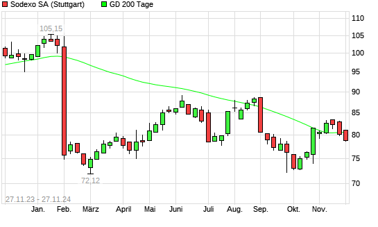 Mit dem Rücksetzer auf 79,10 EUR hat die Sodexo-Aktie am 26.11.2024 die 200-Tage-Linie nach unten gekreuzt.