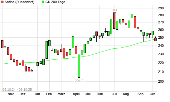 Mit dem Rücksetzer auf 246,60 EUR hat die Sofina-Aktie am 08.10.2025 die 200-Tage-Linie nach unten gekreuzt.