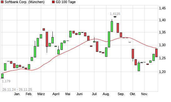 Mit dem Rücksetzer auf 1,22 EUR hat die Softbank Corp.-Aktie am 25.11.2025 die 100-Tage-Linie nach unten gekreuzt.