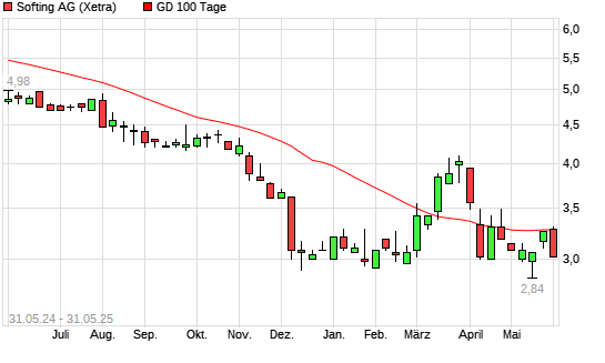 Mit dem Rücksetzer auf 2,96 EUR hat die Softing-Aktie am 30.05.2025 die 100-Tage-Linie nach unten gekreuzt.