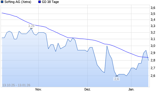 Mit dem Anstieg auf 2,80 EUR hat die Softing-Aktie am 12.01.2026 die 38-Tage-Linie nach oben gekreuzt.Die Softing-Aktie befindet sich seit dem 30.09.2025 im langfristigen Abwärtstrend ...weiterlesen