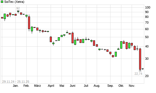Mit dem Rücksetzer auf 23,25 EUR hat die Soitec-Aktie (ISIN FR0013227113) am 24.11.2025 ein neues 5-Jahres-Tief erreicht und damit den Kurs vom 21.11.2025 eingestellt.