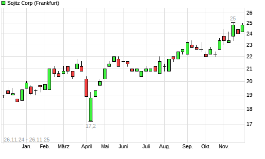 Mit dem Anstieg auf 25,00 EUR hat die Sojitz-Aktie (ISIN JP3663900003) am 25.11.2025 ein neues 12-Monats-Hoch erreicht und damit den Kurs vom 14.11.2025 eingestellt.