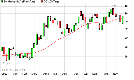 Mit dem Anstieg auf 34,15 EUR hat die Sol S.P.A.-Aktie am 19.11.2024 die 100-Tage-Linie nach oben gekreuzt.