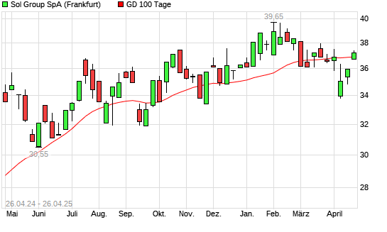 Mit dem Rücksetzer auf 35,80 EUR hat die Sol S.P.A.-Aktie am 25.04.2025 die 100-Tage-Linie nach unten gekreuzt.