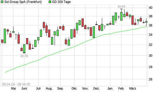 Mit dem Rücksetzer auf 34,40 EUR hat die Sol S.P.A.-Aktie am 04.04.2025 die 200-Tage-Linie nach unten gekreuzt.