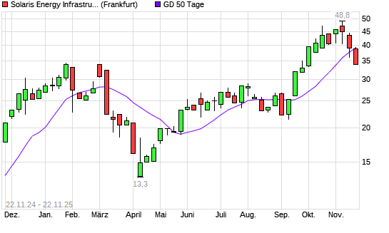 Mit dem Rücksetzer auf 34,00 EUR hat die Solaris Energy Infrastructure-Aktie am 21.11.2025 die 50-Tage-Linie nach unten gekreuzt.