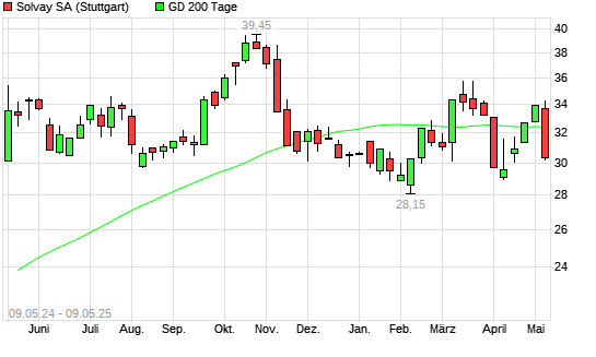 Mit dem Rücksetzer auf 31,64 EUR hat die Solvay-Aktie am 08.05.2025 die 200-Tage-Linie nach unten gekreuzt.