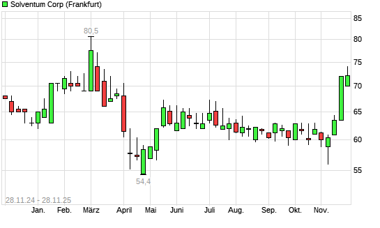 Mit dem Anstieg auf 74,40 EUR hat die Solventum Corp-Aktie (ISIN US83444M1018) am 27.11.2025 ein neues 6-Monats-Hoch erreicht und damit den Kurs vom 25.11.2025 eingestellt.
