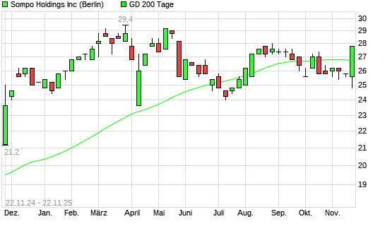 Mit dem Anstieg auf 27,60 EUR hat die Sompo Holdings-Aktie am 21.11.2025 die 200-Tage-Linie nach oben gekreuzt.