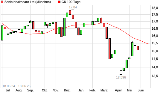 Mit dem Rücksetzer auf 14,82 EUR hat die Sonic Healthcare-Aktie am 17.06.2025 die 100-Tage-Linie nach unten gekreuzt.