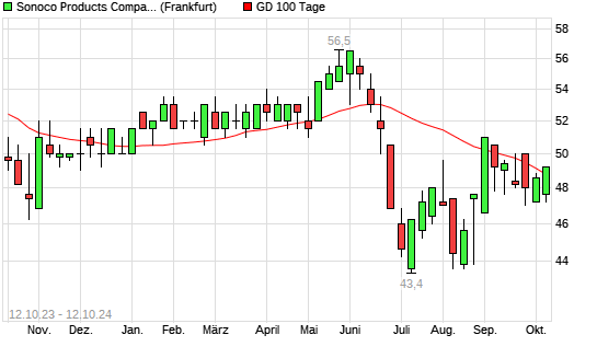 Mit dem Anstieg auf 49,20 EUR hat die Sonoco Products-Aktie am 11.10.2024 die 100-Tage-Linie nach oben gekreuzt.