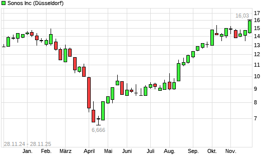 Mit dem Anstieg auf 15,93 EUR hat die Sonos-Aktie (ISIN US83570H1086) am 27.11.2025 ein neues 12-Monats-Hoch erreicht und damit den Kurs vom 26.11.2025 eingestellt.