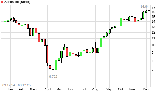 Mit dem Anstieg auf 16,08 EUR hat die Sonos-Aktie (ISIN US83570H1086) am 08.12.2025 ein neues 12-Monats-Hoch erreicht und damit den Kurs vom 03.12.2025 eingestellt.