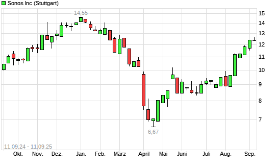 Mit dem Anstieg auf 12,54 EUR hat die Sonos-Aktie (ISIN US83570H1086) am 10.09.2025 ein neues 6-Monats-Hoch erreicht und damit den Kurs vom 09.09.2025 eingestellt.