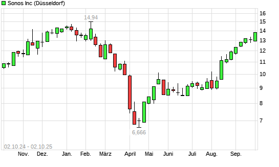 Mit dem Anstieg auf 13,45 EUR hat die Sonos-Aktie (ISIN US83570H1086) am 01.10.2025 ein neues 6-Monats-Hoch erreicht und damit den Kurs vom 22.09.2025 eingestellt.