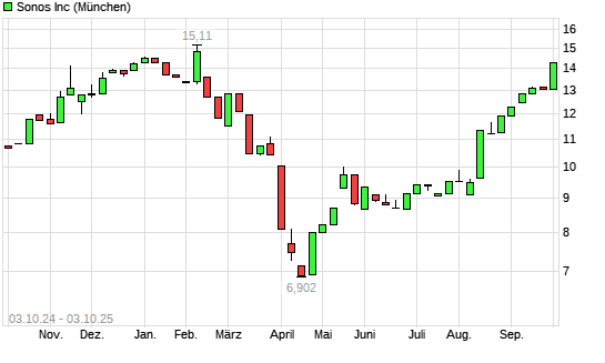 Mit dem Anstieg auf 14,05 EUR hat die Sonos-Aktie (ISIN US83570H1086) am 02.10.2025 ein neues 6-Monats-Hoch erreicht und damit den Kurs vom 01.10.2025 eingestellt.