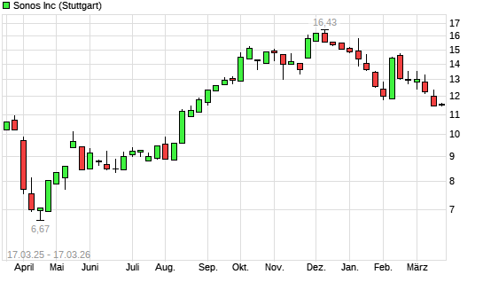 Mit dem Rücksetzer auf 11,50 EUR hat die Sonos-Aktie (ISIN US83570H1086) am 16.03.2026 ein neues 6-Monats-Tief erreicht und damit den Kurs vom 09.03.2026 eingestellt.