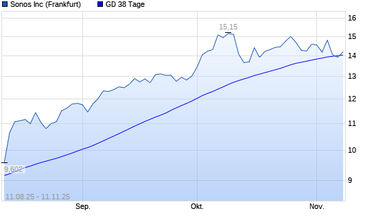 Mit dem Anstieg auf 14,19 EUR hat die Sonos-Aktie am 10.11.2025 die 38-Tage-Linie nach oben gekreuzt.