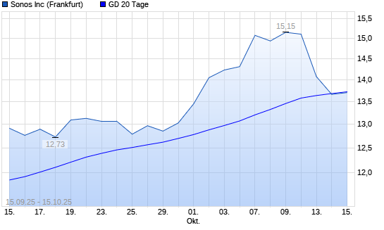 Mit dem Rücksetzer auf 13,66 EUR hat die Sonos-Aktie am 14.10.2025 die 20-Tage-Linie nach unten gekreuzt.