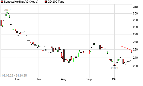 Mit dem Anstieg auf 248,90 EUR hat die Sonova Holding-Aktie am 23.10.2025 die 100-Tage-Linie nach oben gekreuzt.