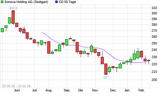 Mit dem Rücksetzer auf 223,10 EUR hat die Sonova Holding-Aktie am 09.02.2026 die 50-Tage-Linie nach unten gekreuzt.