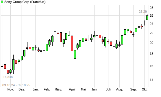 Mit dem Anstieg auf 25,80 EUR hat die Sony-Aktie (ISIN JP3435000009) am 08.10.2025 ein neues 10-Jahres-Hoch erreicht und damit den Kurs vom 06.10.2025 eingestellt.