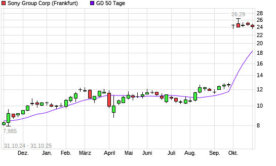 Mit dem Rücksetzer auf 23,69 EUR hat die Sony-Aktie am 30.10.2025 die 50-Tage-Linie nach unten gekreuzt.