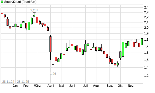 Mit dem Anstieg auf 1,82 EUR hat die South32-Aktie (ISIN AU000000S320) am 27.11.2025 ein neues 6-Monats-Hoch erreicht und damit den Kurs vom 09.10.2025 eingestellt.