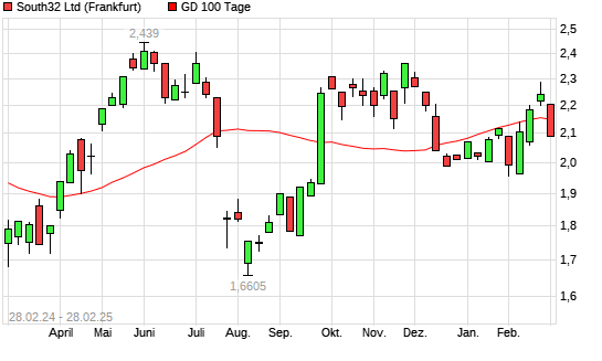 Mit dem Rücksetzer auf 2,14 EUR hat die South32-Aktie am 27.02.2025 die 100-Tage-Linie nach unten gekreuzt.
