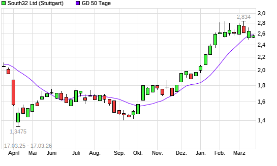 Mit dem Rücksetzer auf 2,52 EUR hat die South32-Aktie am 16.03.2026 die 50-Tage-Linie nach unten gekreuzt.