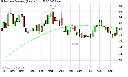 Mit dem Anstieg auf 80,15 EUR hat die Southern Company-Aktie am 25.09.2025 die 200-Tage-Linie nach oben gekreuzt.