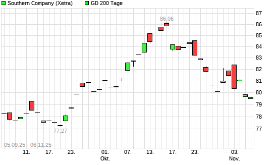 Mit dem Rücksetzer auf 80,44 EUR hat die Southern Company-Aktie am 05.11.2025 die 200-Tage-Linie nach unten gekreuzt.
