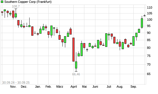 Mit dem Anstieg auf 103,90 EUR hat die Southern Copper-Aktie (ISIN US84265V1052) am 29.09.2025 ein neues 6-Monats-Hoch erreicht und damit den Kurs vom 24.09.2025 eingestellt.