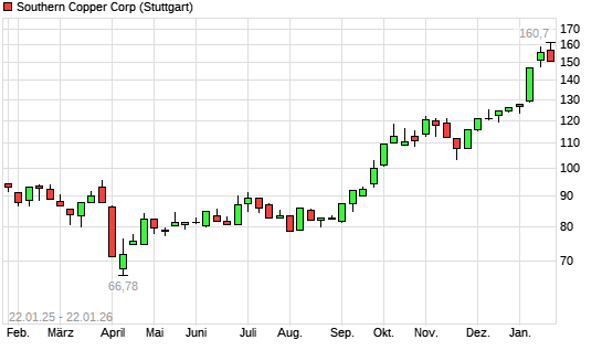 Mit dem Anstieg auf 158,25 EUR hat die Southern Copper-Aktie (ISIN US84265V1052) am 21.01.2026 ein neues All-Time-High erreicht und damit den Kurs vom 15.01.2026 eingestellt.