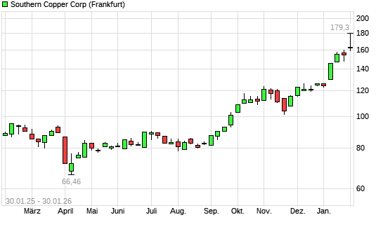 Mit dem Anstieg auf 174,00 EUR hat die Southern Copper-Aktie (ISIN US84265V1052) am 29.01.2026 ein neues All-Time-High erreicht und damit den Kurs vom 28.01.2026 eingestellt.