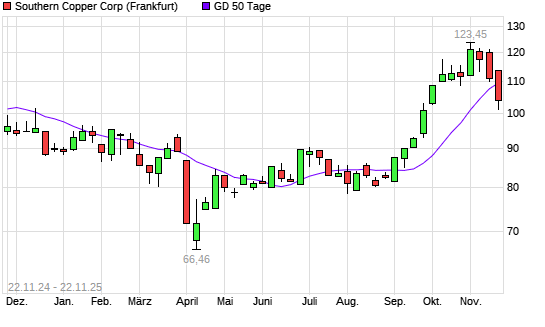 Mit dem Rücksetzer auf 104,10 EUR hat die Southern Copper-Aktie am 21.11.2025 die 50-Tage-Linie nach unten gekreuzt.