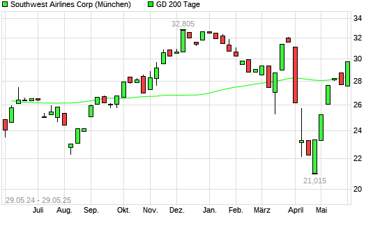 Mit dem Anstieg auf 28,71 EUR hat die Southwest Airlines-Aktie am 28.05.2025 die 200-Tage-Linie nach oben gekreuzt.