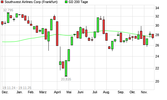 Mit dem Rücksetzer auf 27,41 EUR hat die Southwest Airlines-Aktie am 18.11.2025 die 200-Tage-Linie nach unten gekreuzt.