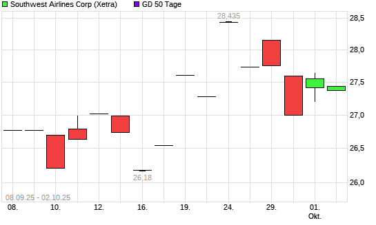Mit dem Rücksetzer auf 26,86 EUR hat die Southwest Airlines-Aktie am 01.10.2025 die 50-Tage-Linie nach unten gekreuzt.