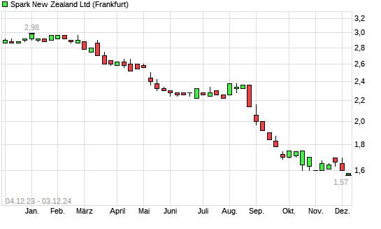 Mit dem Rücksetzer auf 1,57 EUR hat die Spark New Zealand-Aktie (ISIN NZTELE0001S4) am 02.12.2024 ein neues 10-Jahres-Tief erreicht und damit den Kurs vom 18.08.2015 eingestellt.