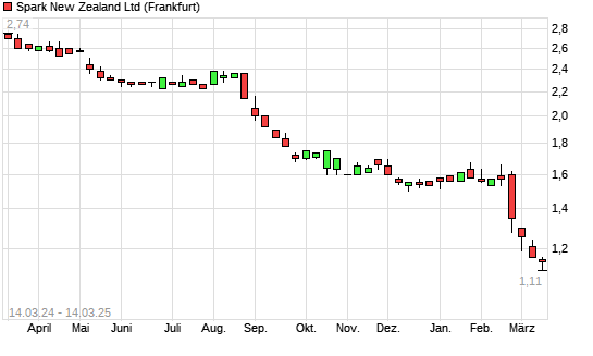 Mit dem Rücksetzer auf 1,12 EUR hat die Spark New Zealand-Aktie (ISIN NZTELE0001S4) am 13.03.2025 ein neues 10-Jahres-Tief erreicht und damit den Kurs vom 11.03.2025 eingestellt.