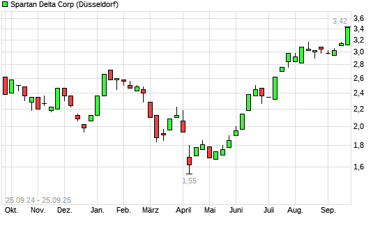 Mit dem Anstieg auf 3,28 EUR hat die Spartan Delta-Aktie (ISIN CA84678A5089) am 24.09.2025 ein neues 12-Monats-Hoch erreicht und damit den Kurs vom 23.09.2025 eingestellt.
